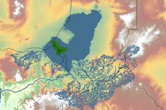 As plantas de zonas húmidas no Sul incluem principalmente cyperus papyrus, entre outras. Os juncos crescem principalmente no Norte, onde a salinidade é elevada, e a planta flutuante pistia por vezes cobre grandes áreas de águas abertas. Plantas como a hyparrhenia rufa crescem nas margens de lagos com cheias prolongadas no Sul.[30] A área de vegetação permanente aumentou de cerca de 3800 quimómetros quadrados em 2000 para cerca de 5200 quimómetros quadrados em 2020, à medida que os níveis de água baixaram e as temperaturas aumentaram.[31] A densa floresta circundante foi convertida em floresta aberta com acácias, baobás, palmeiras e jujuba indiana.[1]