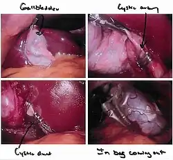 Uma vez concluído o procedimento o gás na cavidade é esvaziado, os trocateres retirados e os portais fechados pela sutura da aponeurose da parede abdominal e a pele.