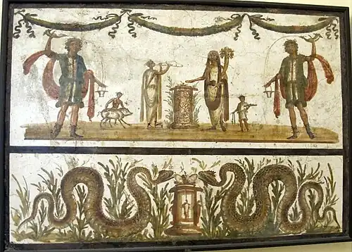 - ↑ BOYCE, George K. Significance of the serpents on Pompeian house shrines. American Journal of Archaeology, vol. 46, n. 1, jan.-mar. de 1942. p. 15 e 16.