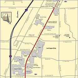 A Sahara Avenue é amplamente considerado o terminal norte da Strip, embora os guias de viagem normalmente o estendam até 0,4 milhas (0,64 km) ao norte. O Mandalay Bay, ao norte de Russell Road, é o resort mais ao sul considerado na Strip.[2]