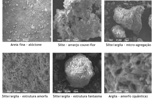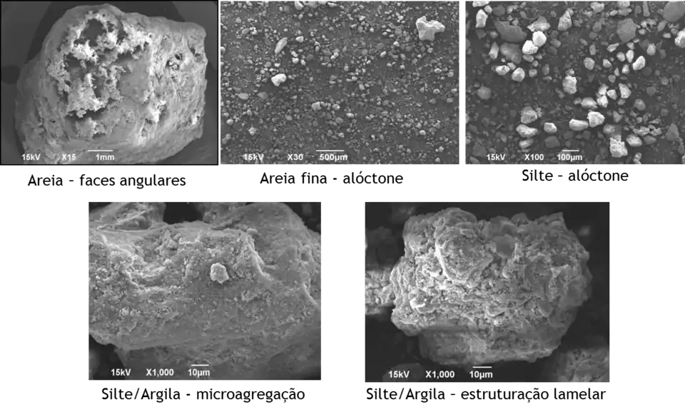 Nas imagens onde se observa a fração silte (ampliação de 1000x) é possível identificar a estruturação lamelar das camadas de deposição de óxidos em um núcleo provavelmente de sílica. Essa observação condiz com a gênese dos lateritos que se formam com agregação de camadas de óxidos sazonalmente pela variação do lençol freático em ambiente de pH baixo.