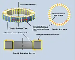 Um solenoide toroidal ou toroide é um solenoide que conduz uma corrente através de um enrolamento com espiras em torno de um núcleo em forma de rosca. Com uma aproximação idealizada, a simetria circular da configuração nos leva a concluir que as linhas de campo magnético são circunferências concêntricas com o eixo do toroide. Esta argumentação é válida porque consideramos o fluxo da corrente através da periferia do toroide desprezível. O campo magnético de um toroide está inteiramente confinado ao espaço no interior das espiras (o campo é zero fora do toroide).