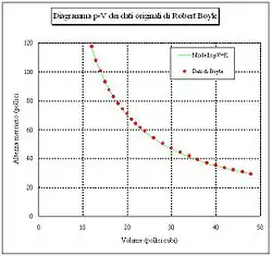 Forçando a aumentar o volume V de uma quantidade fixa de gás, mantendo o gás a temperatura inicial, a pressão P deve diminuir proporcionalmente. Reciprocamente, reduzir o volume do gás aumenta a pressão.