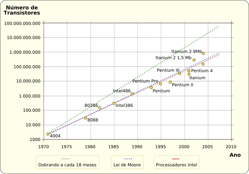 Lei de Moore é uma expressão referente a observação feita por Gordon Moore (químico estadunidense cofundador da Intel) em 1965 no artigo “Cramming More Components onto Integrated Circuits” sobre a tendência histórica da indústria de microchips e processadores.[1] Ou seja, observação sobre o ritmo da evolução na computação eletrônica,[1] informa que o número de transistores dos chips teria um aumento de 100%, pelo mesmo custo, a cada dois anos.
