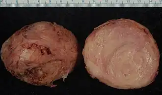 | Leiomioma uterino cortado ao meio. | |