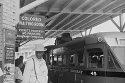 O princípio legal da segregação racial de "separados, mas iguais" foi estendido às instalações e aos transportes públicos, incluindo os ônibus e trens interestaduais. As instalações para afro-americanos e nativos americanos eram consistentemente inferiores e subfinanciadas em comparação com as instalações para americanos brancos; às vezes, não havia instalações para pessoas de cor.[4][5] No seu corpo, as leis Jim Crow institucionalizaram desvantagens econômicas, educacionais e sociais para afro-americanos e outras pessoas de cor que vivem no sul.[4][5][6]