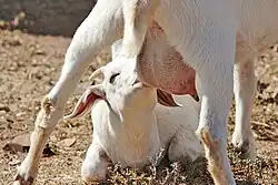 - A cabra: começou a ser domesticada principalmente no vale do rio Eufrates e nos montes Zagros, a partir da espécie Capra hircus aproximadamente ao mesmo tempo que as vacas (10 500 anos).[28][29] Possui um leite com um sabor e aroma fortes. O leite caprino é um pouco diferente do de ovelha, principalmente no sabor, contém uma maior quantidade de sais, o que lhe dá o sabor levemente salgado. Além disso, é mais rica em natas (caseinatos), e apresenta maiores níveis de cálcio. O leite de cabras apresenta em sua composição maior teor de α-caseína aliado ao tamanho das micelas de gordura serem menores quando comparado com leite de vaca, o que lhe confere características medicinais, sendo muito utilizado no controle de problemas de intolerância a leite de outras espécies, problemas respiratórios como asma, bronquite e problemas gastrointestinais. Com a gordura deste leite se fabrica o queijo de cabra, iogurte, e atualmente cosméticos. Dentre as raças caprinas especializadas na produção de leite destacam-se as cabras: Saanen, Pardo Alpina, Toggenbourg, Alpina Americana e Anglo-Nubiana.