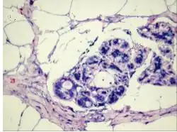 Do ponto de vista histológico, o leite se produz nas glândulas mamárias, que são uma evolução por hipertrofia das glândulas sudoríparas apócrinas associadas ao pelo, o qual ainda se evidencia nos ornitorrincos.[24] A glândula mamária ativa é composto por lóbulos, cada um dos quais possui numerosos alvéolos e estes, por sua vez, são revestidos por células epiteliais cúbicas altas ou baixas, dependendo do ciclo de atividade, que são as encarregadas de produzir o leite. Entre estas e a lâmina basal do alvéolo se encontram algumas células mioepiteliais estriadas. O epitélio dos dutos entre os alvéolos é um bom exemplo de epitélio biestratificado cúbico (Bloom-Fawcet, 1999).