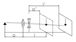 O processo para se determinar a distância focal de lentes divergentes é um pouco mais complexo[4]. É preciso um objeto virtual (mostrado tracejado na figura) obtido através de uma lente convergente. Para certa posição do objeto, localize e anote a posição i da imagem (objeto virtual) no anteparo e a distância da imagem real da lente convergente i.. A seguir coloque (como mostra a figura) uma lente divergente entre a lente convergente e o anteparo. A posição da imagem real dada pela lente convergente (tracejada) será a posição do objeto virtual para a lente divergente. Localize a imagem da lente divergente mudando a posição do anteparo (e da lente divergente caso seja preciso) para um ponto diferente (anteparo com linhas contínuas na figura), e determine a distância i' da imagem da lente divergente. Meça também a distância o' entre o objeto virtual e a lente divergente.