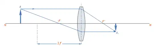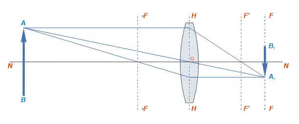 A construção das imagens de lentes de objetos com um certo tamanho e forma, é obtido como se segue: digamos a linha AB é o objeto localizado a alguma distância da lente, muito acima da sua distância focal. A partir de cada ponto do objeto através da lente sairão inúmeros raios, dos quais, por motivos de clareza, a figura mostra, esquematicamente, o curso de apenas três raios.