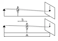 Como mostra a figura ao lado, devemos mover a lente até acharmos as duas posições em que a imagem do objeto se tornará nítida e aplicarmos essas medidas.