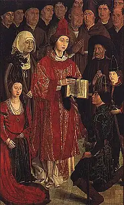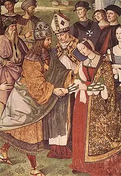 Eneias Sílvio Piccolomini (o futuro Papa Pio II) celebrando o casamento de Frederico III, Imperador do Sacro Império, com a infanta portuguesa D. Leonor (fresco de Pinturicchio).
