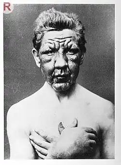 A lepra é uma doença infectocontagiosa crónica causada pela bactéria Mycobacterium leprae.[11][17][18] Esta doença é particularmente conhecida por causar deficiências debilitantes e incapacidades associadas a danos no sistema nervoso periférico, na pele, mucosa nasal, olhos e, nas formas mais graves, nos órgãos internos e sistemas muscular e esquelético.[19][20][21][22][23]