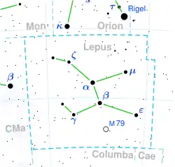 Mu Leporis - é uma variável tipo alfa CV que oscila de 2.97 a 3.41 cada dois dias. estrela de magnitude visual 3.29, absoluta -0.47; dista 184 anos-luz e tem 3.5 raios solares; temperatura superficial 10500 K e classe espectral B9IV.