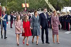A rainha Letizia, as princesas Leonor e Sofía, o presidente Mariano Rajoy, e a ministra da Defesa, María Dolores de Cospedal, durante um desfile militar.