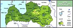O mar Báltico banha a costa da Letónia, que abunda nas praias arenosas e chama o golfo de Riga. No interior, quase toda a superfície é ocupada por grandes planícies, apenas interrompido por baixas colinas que exceder 300 m. Os mais de 2 300 lagos glaciares, dos quais o maior é o Lago Lubāns, e as turfeiras e pantanosos áreas são os mais importantes elementos da paisagem. O principal é o rio Daugava (Western Dvina tão bem conhecido), nascido na Rússia.