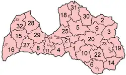 A Letónia está dividida em 26 distritos (rajoni, singular: rajons; ou ainda apriņķi, singular: apriņķis) e 7 cidades independentes (lielpilsētas, singular: lielpilsēta). Apesar das cidades estarem localizadas geograficamente dentro dos distritos elas possuem estatuto diferenciado e são administradas separadamente.