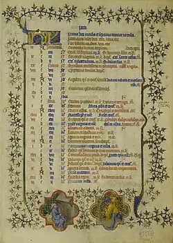 - Letras dominicais na página do Calendário para o mês de Janeiro, em folha de pergaminho[9] (17,0 x 24,0 cm), iluminada, (c. 1401-1433), do Livro de Horas de D. Duarte de Portugal, guardado na Torre do Tombo, em Lisboa, e com algumas semelhanças com a iluminura anterior do Calendário de Paris, como os motivos vegetalistas e a abreviatura KL.