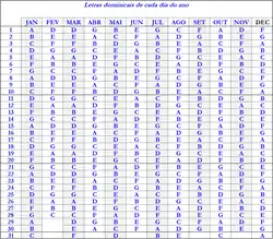 Com esta tabela, podemos saber sempre em que dia é domingo e em que dia da semana estamos. Podemos agora notar que os meses de janeiro e outubro começam com a letra A, o mês de maio com a B, o de agosto com a C, os meses de fevereiro, março e novembro com a letra D, o mês de junho com a letra E, os meses de setembro e de dezembro com a letra F e os meses de abril e julho com a letra G.