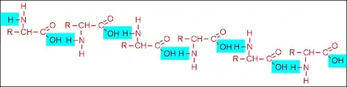 A ligação covalente C-N resultante é chamada ligação peptídica e a grupo funcional resultante é uma amida . Polipeptídeos e proteínas são cadeias de aminoácidos presas por ligações peptídicas. A espinha dorsal do PNA (quimicamente similar ao DNA e RNA) também é mantido por este tipo de ligação.