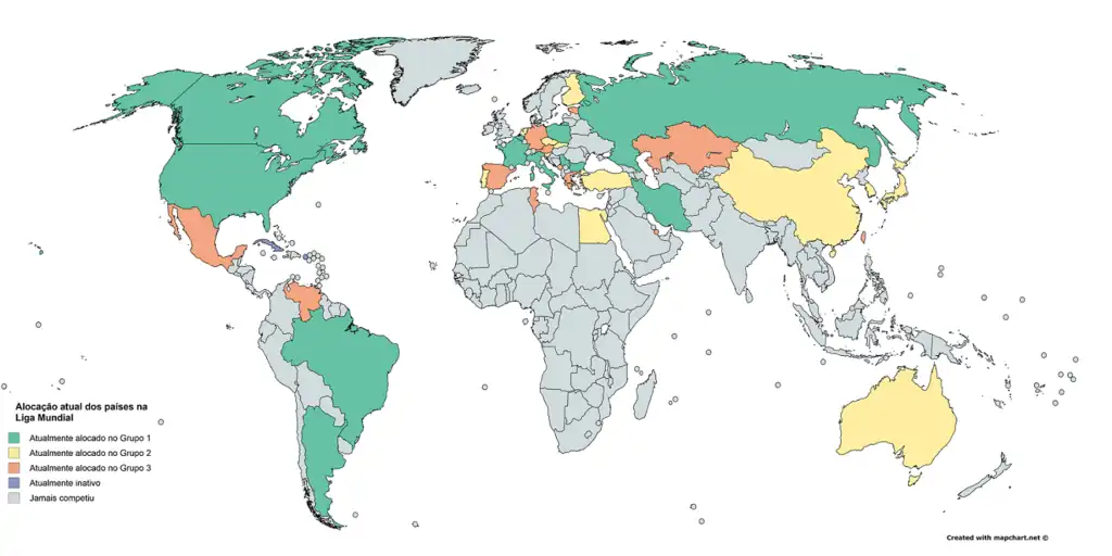 - Iniciando em 2014, a FIVB aumentou o número de participantes e dividiu as equipes em três diferentes divisões (denominados "Grupos"), de acordo com o ranking mundial.
