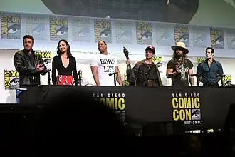 Ben Affleck, Gal Gadot, Ray Fisher, Ezra Miller, Jason Momoa e Henry Cavill em 2016 San Diego Comic-Con para promover Liga da Justiça.