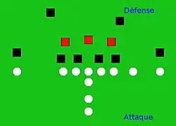 Dois linebackers (MLB & LLB), de vermelho, apoiando sua Linha defensiva enquanto o RLB, abaixo na direita, ameaça fazer a blitz.