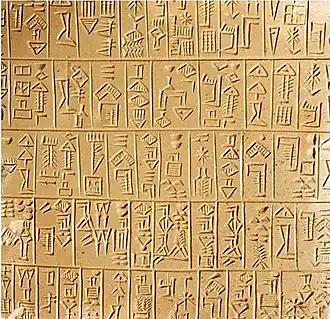 Inscrição cuneiforme suméria em estilo arcaico monumental, cerca do século XXVI a.C., Mesopotâmia.