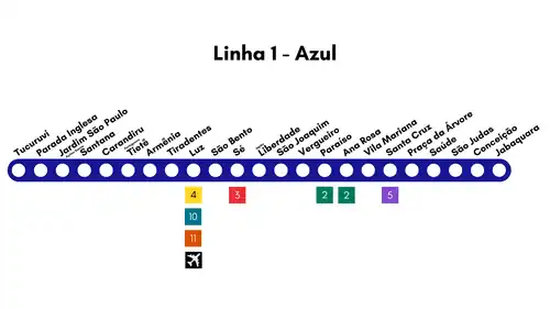 Linha 1 do Metropolitano de São Paulo | ||||||||||||||||||||||||||||||||||||||||||||||||||||||||||||||||||||||||||||||||||||||||||||||||||||||||||||||||||||||||||||||||||||||||||||||||||||||||||||||||||||||||||||||||||||||||||||||||||||||||||||||||||||||||||||||||||||||||||||||||||||||||||||||||||||||||||||||||||||||||||||||||||||||||||||||||||||||||||||||||||||||||||||||||||||||||||||||||||||||||||||||||||||||||||||||||||||||||||||||||||||||||||||||||||||||||||||||||||||||||||||||||||||||||||||||||||||||||||||||||||||||||||||||||