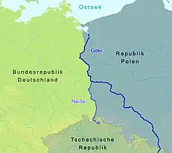 A linha demarcada segue os rios Oder e Neisse primariamente, mas desviou-se para oeste na sua parte norte, para que deste modo a Polónia obtivesse as cidades de Świnoujście e Szczecin.