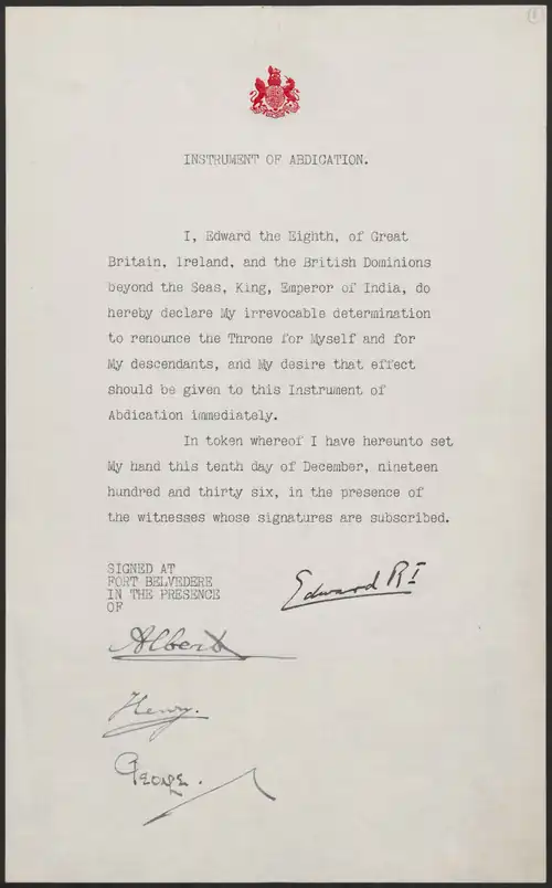 A sucessão entrou em controvérsia em 1936, quando Eduardo VIII abdicou. O monarca havia contraído matrimônio com Wallis Simpson - uma divorciada -, sendo que a Igreja de Inglaterra não aceita novas núpcias de divorciados.[9] Como foi do desejo expresso de Eduardo VIII, o Parlamento aprovou sua "Declaração de Abdicação de 1936", cessando seus direitos como soberano britânico.[10] Além de retirá-lo do trono, o Ato estabelecia que seus descendentes não poderiam ter "algum direito, título ou interesse à ou na sucessão ao Trono". Eduardo VIII foi sucedido por seu irmão, Jorge VI, que veio a ser sucedido por sua filha, Isabel II.[11][12] Em 2022, após a morte da Rainha, assume o trono o seu filho primogênito, o rei Charles III. Desde 1949, o monarca britânico já não reinava sobre a Irlanda em sua totalidade, porém permanece até os dias atuais como soberano em um série de Estados independentes agrupados como Reinos da Comunidade de Nações.