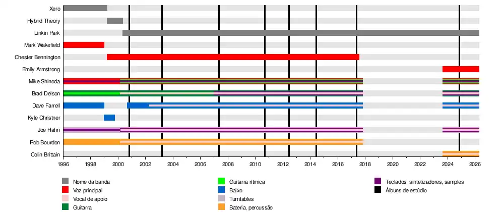 ![]() Integrantes da banda em 2024, da esquerda para direita: Dave Farrell, Brad Delson, Joe Hahn, Emily Armstrong, Colin Brittain e Mike Shinoda | |
