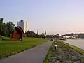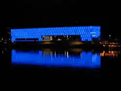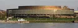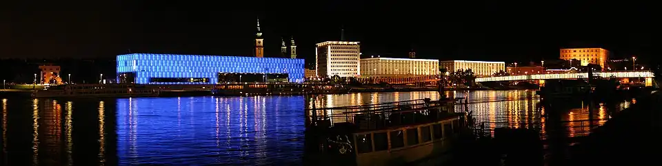 Lentos, construído em 2003, abriga uma nova galeria de artes modernas. Está localizado na margem sul do Danúbio. O prédio é iluminado em azul, rosa e roxo durante a noite.