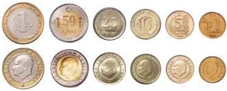 - Moedas de 1, 5, 10, 25 e 50 novos kuruş e de 1 nova lira;