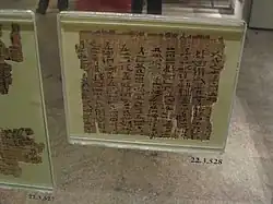 Durante o final do Império Médio, pode ser vista uma maior padronização da fórmula epistolar, por exemplo, em uma série de cartas modelo tiradas de despachos enviados à fortaleza Semna na Núbia durante o reinado de Amenemés III (r. 1860–1814 a.C.).[204] Epístolas também foram escritas durante as três dinastias do Império Novo.[205] Enquanto cartas aos mortos eram escritas desde o Império Antigo, a escrita de cartas de petição em forma epistolar para divindades começou no Período Raméssida, tornando-se muito popular durante os períodos persa e ptolemaico.[206]