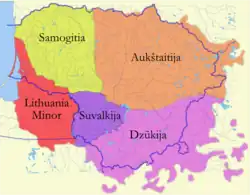 Além dos diversos grupos religiosos e étnicos que viveram e vivem atualmente na Lituânia, os lituanos costumam dividir a si próprios em cinco grupos diferentes: Žemaičiai, Suvalkiečiai, Aukštaičiai, Dzūkai e Prūsai,[17] dos quais o último está virtualmente extinto. Os moradores das cidades são considerados apenas 'lituanos'[carece de fontes], especialmente os moradores de grandes centros urbanos, como Vilnius ou Kaunas.