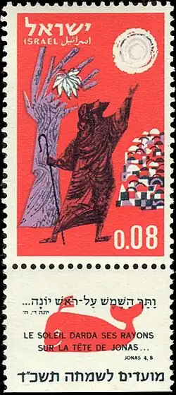 Descontente e enfurecido por isso, Jonas se refere à sua viagem anterior para Társis, afirmando que, como Deus é misericordioso, era inevitável que Deus se afastasse das calamidades ameaçadas.[18] Ele então sai da cidade e construiu para si um abrigo, esperando para ver se a cidade será ou não destruída.[19] Deus faz com que uma planta (em hebraico: um kikayon) cresça sobre o abrigo de Jonas, para lhe dar alguma sombra do sol.[20] Mais tarde, Deus faz com que uma lagarta morda a raiz da planta e ela murcha.[21] Jonas, agora sendo exposto a toda a força do sol, quase desmaia e pede a Deus que o mate.[22]