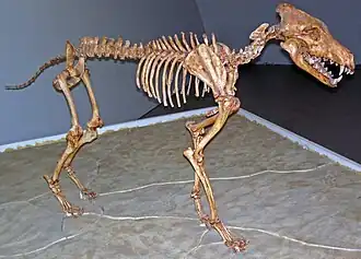 O lobo terrível (Aenocyon dirus) é uma espécie canina extinta que viveu nas Américas durante as épocas do Pleistoceno Superior e do Holoceno Inferior. O primeiro fóssil atribuído a essa espécie foi um osso da mandíbula descoberto em 1854 perto de Evansville, Indiana, por Joseph Granville Norwood e Francis A. Linck. Inicialmente, em 1858, o paleontólogo Joseph Leidy o nomeou Canis dirus. Com o tempo, diversos fósseis levaram a múltiplas denominações, como Canis primaevus, Canis indianensis e Canis mississippiensis. Em 1918, John Campbell Merriam propôs reclassificar o lobo terrível em um novo gênero, Aenocyon, que significa "lobo terrível", mas essa sugestão não foi amplamente aceita na época.[2]