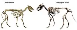 Esqueleto de lobo cinzento (à esquerda) comparado com o esqueleto de um lobo terrível