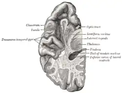- Áreas adjacentes nas partes superior, posterior e lateral dos lobos temporais estão envolvidas no processamento auditivo de alto nível. O lobo temporal está envolvido na percepção auditiva primária, como a audição, e contém o córtex auditivo primário .[6] O córtex auditivo primário recebe informações sensoriais dos ouvidos e as áreas secundárias processam as informações em unidades significativas, como fala e palavras.[6] O giro temporal superior inclui uma área (dentro da fissura lateral) onde os sinais auditivos da cóclea alcançam primeiro o córtex cerebral e são processados pelo córtex auditivo primário no lobo temporal esquerdo.