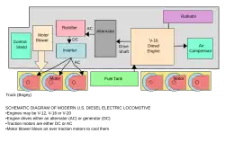 Originalmente os motores de tração e o gerador principal são máquinas CC. Seguindo o desenvolvimento de retificadores de alta capacidade nos anos 60, o gerador CC foi substiuído por um alternador usando ponte de diodo para retificar a saída para CC. Isto aumentou a confiabilidade das locomotivas e minimizou os custos de manutenção pela eliminação do comutador e escovas. A eliminação das escovas e comutador, por sua vez, resolveu um tipo de evento particularmente destrutivo relacionado a faiscamento, que comumente causa falha imediata do gerador e, em alguns casos, início de incêndio na casa de máquinas.