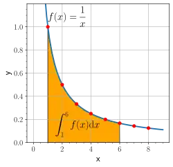 Em outras palavras, ln(t) é igual à área entre o eixo das abcissas e o gráfico da função 1/x, variando de x = 1 a x = t, tal como na figura ao lado. Esta é uma consequência do teorema fundamental do cálculo e do fato de que a derivada de ln(x) é 1/x. As fórmulas do logaritmo de produtos e potências podem ser derivadas a partir dessa definição (utilizando como exemplo, ln(tu) = ln(t) + ln(u)):[101]