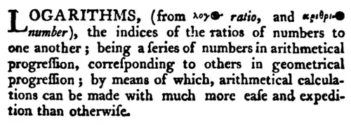 O conceito de logaritmo foi introduzido por John Napier no ano de 1614, a fim de simplificar cálculos, daí a nomenclatura logaritmo neperiano.[6] Ele foi rapidamente adotado por navegadores, cientistas, engenheiros e outros profissionais para facilitar seus cálculos, através do uso de réguas de cálculo e tabelas logarítmicas. Algumas etapas tediosas da multiplicação com vários dígitos podem ser substituídas por consultas a tabelas ou por somas mais simples devido ao fato de o logaritmo de um produto ser o somatório dos logaritmos dos fatores:[7]