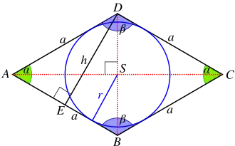 onde K é a área de um dos triângulos, p e q as diagonais do losango.[5] A correspondência com a área da primeira abordagem é demonstrada na análise do incentro.