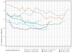 Índices de audiência de Lost nos Estados Unidos (baseado na média de exibições por episódio, incluindo reprises).