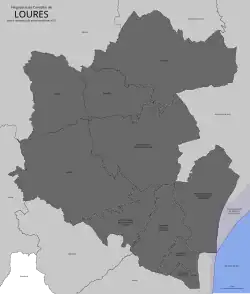 É sede do Município de Loures que tem 201 590 habitantes[1] e 167,24 km2 de área,[2] subdividido em 10 freguesias.[3] O município é limitado a norte pelo município de Arruda dos Vinhos, a leste por Vila Franca de Xira e pelo estuário do Tejo (território oficialmente atribuído também a Vila Franca de Xira), a sudeste por Lisboa, a sudoeste por Odivelas, a oeste por Sintra e a noroeste por Mafra.