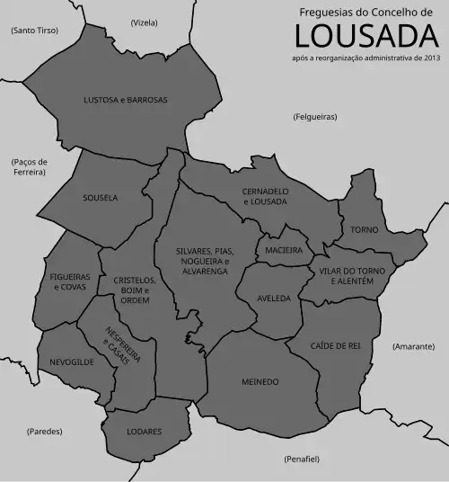 O município de Lousada está atualmente dividido em 16 freguesias. A última alteração administrativa ocorreu em 13 de março de 2025, com a aprovação da Lei n.º 25-A/2025[8], que repôs várias freguesias anteriormente agregadas; em Lousada, Lustosa e Barrosas voltaram a constituir freguesias autónomas.