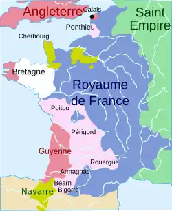 Mapa das possesões inglesas (a vermelho) na França no início da Guerra dos Cem Anos. A extensão do ducado da Aquitânia, que seria renomeado para Guyenne no reinado de São Luís, é sensivelmente a deixada por o Leão depois das suas conquistas.