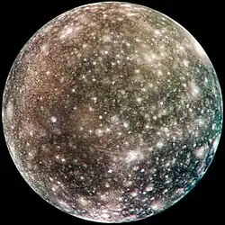Calisto (Jupiter IV) é a quarta e última lua galileana, e é a segunda maior das quatro, e com 4.820.6 quilômetros de diâmetro, é a terceira maior satélite natural do Sistema Solar, e pouco menor que Mercúrio, embora apenas um terço de sua massa. Seu nome é uma homenagem à ninfa da mitológica grega Calisto, uma amante de Zeus que era filha do rei arkadiano Licaão e companheira de caça da deusa Ártemis. A lua não faz parte da ressonância orbital que afeta os três outros satélites internos galileanos e, portanto, não experimenta um aquecimento considerável das marés.[44] Calisto é composta por quantidades aproximadamente iguais de rocha e gelo, o que a torna a menos densa das luas galileanas. É um dos satélites com mais crateras no Sistema Solar e uma das principais características é uma bacia com cerca de 3 000 km de largura chamada Valhalla.[45]