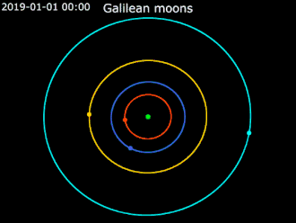 Animações GIF representando as órbitas das luas galileanas e a ressonância de Io, Europa e Ganímedes